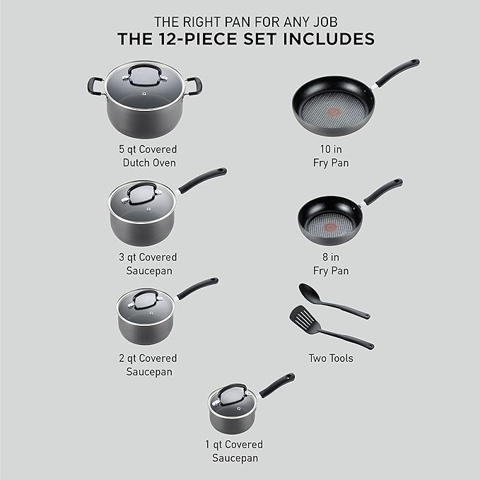 T-fal Ultimate Hard Anodized Nonstick Cookware Set 12 Piece, Oven Broiler Safe 400F, Lid Safe 350F, Kitchen Cooking Set w/Fry Pans, Saucepans, Dutch Oven, Pots and Pans, Dishwasher Safe, Black