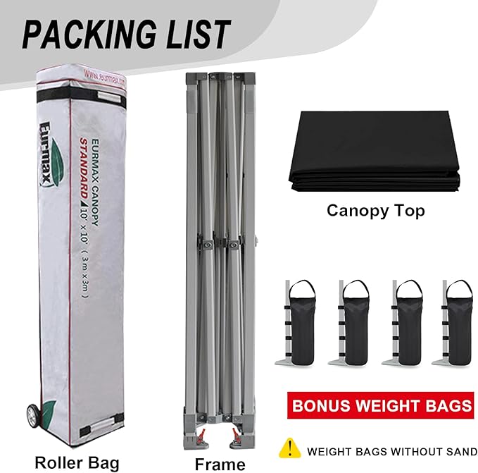 • PACKAGE INCLUDES:10x10 pop up canopy frame + top cover + Eurmax unique L shaped roller bag + Bonus 4 canopy weights bags. NO STAKES!! Top front valance with 4 name banner sleeve to customize and personalize your shelter. Help you attract customers. The roller bag is oversize designed,it is easy to put frame and top in it.Big wheels,strong polyester,2 layers fabric sewed,reinforced handles,all these makes the bag long lasting.