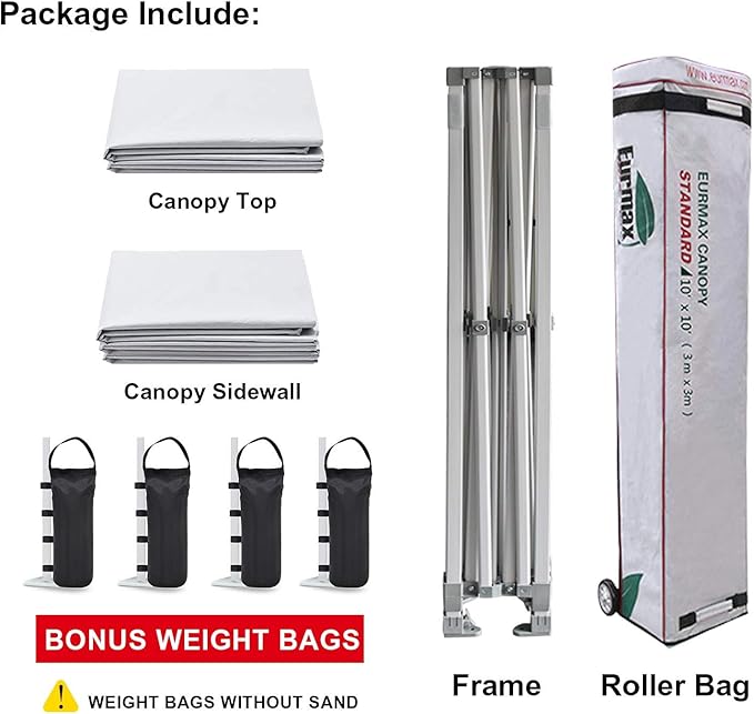 Eurmax USA 10'x10' Pop-up Canopy Tent Commercial Instant Canopies with 4 Removable Zipper End Side Walls and Roller Bag, Bonus 4 SandBags(White)