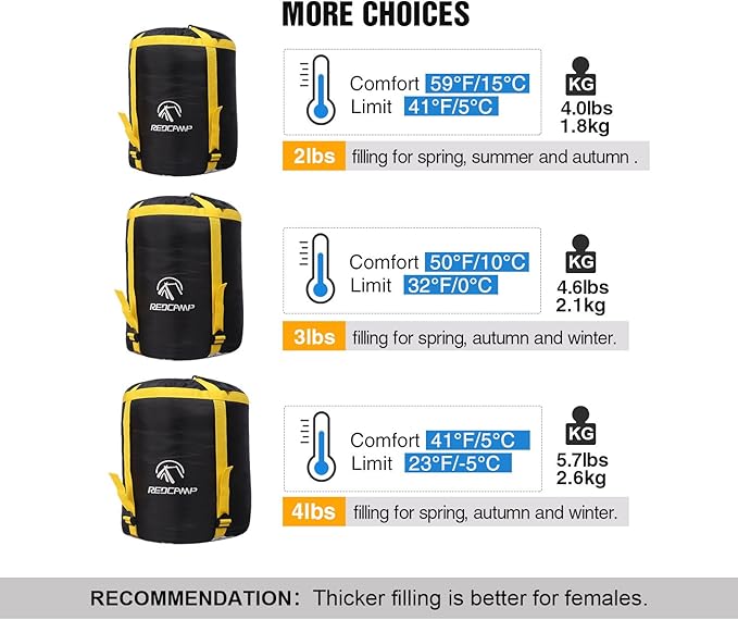 • Temperature Range: 4lbs filling 80% cotton lined adult sleeping bag is comfort in 41°F/5°C, and fits temperature range in 32-59°F/0 - 15°C. 3lbs filling sleeping bags is comfort in 50°F/10°C and fits temperature range 41-68°F/5-15°C. Females are recommended to choose the thicker sleeping bags.
