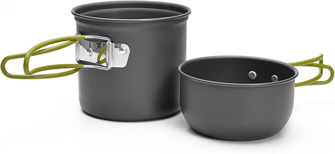 • Best Money Ever Spent: The 9 pieces camping cookware kit includes 1 mini stove + 2 aluminum non-stick pots + 1 spoon + 1 fork + 1 knife + 1 stainless steel cup (16oz) + 1 sillicone insulated cup protector + 2 Carry bag.