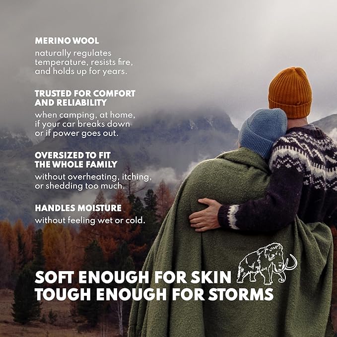 • Rugged Merino Warmth: The Woolly Mammoth Woolen Company's camping blankets combine rugged durability with the luxurious warmth of 80% premium Merino wool. This heavy wool blanket is crafted for cold weather camping and outdoor adventures