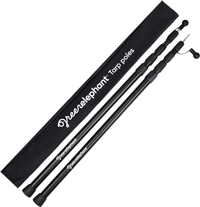 • IMPROVED GREEN ELEPHANT TELESCOPING TARP POLES – Support temporary tarps, awnings, and tents with THE ORIGINAL longest and shortest camping poles for tarp, 4-section design. Our adjustable tarp pole shrinks to 2ft. 9.5 in., extends to 8ft. 2.8 in. and weighs only 1.1 lbs. This durable telescoping tent poles for tarp support up to 50 lbs each
