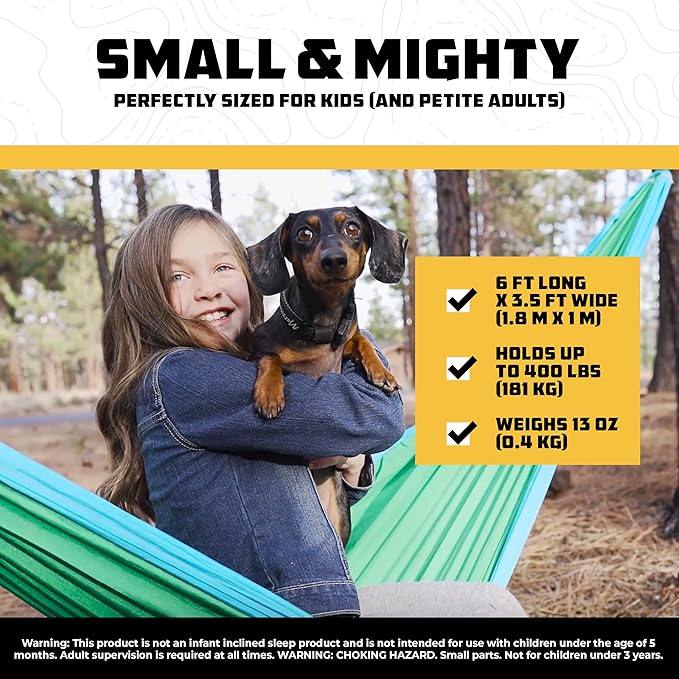 • Compact: Lightweight and convenient, our kids hammock is 6 x 3.5 ft long, weighs only 13 oz, and packs down to the size of an orange. Throw it in your backpack and go.