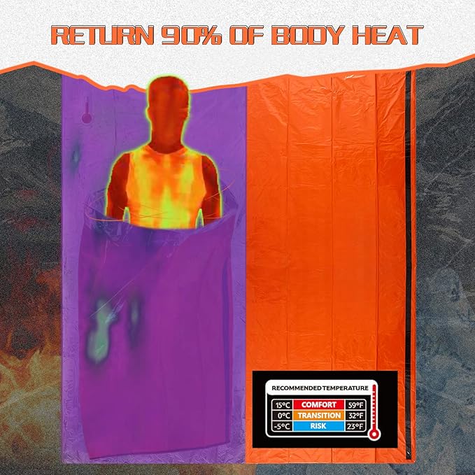 • STAY WARM OVER 24 HOURS: Made out of ultra-lightweight PE material which reflects 90% of your body's heat to you reflective, and its orange color makes it easy for rescuers to find you(And its green color is not easy to see), making it an essential survival tool, Suitable for outdoor camping and hunting, emergency shelter or car emergency kit.