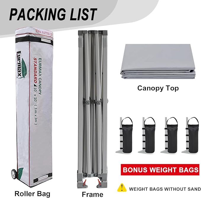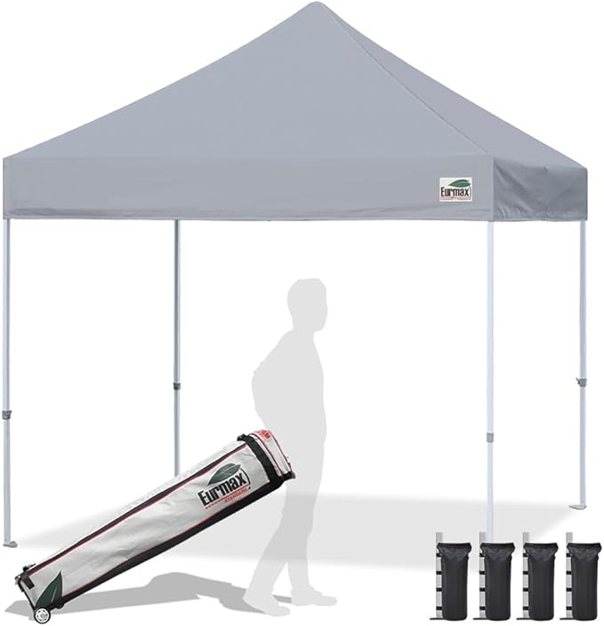 Eurmax USA Standard 10x10ft Patio Pop Up Canopy Tent for Outdoor Events Commercial Instant Canopies with Heavy Duty Roller Bag,Bonus 4 Canopy Sand Bags (Grey)