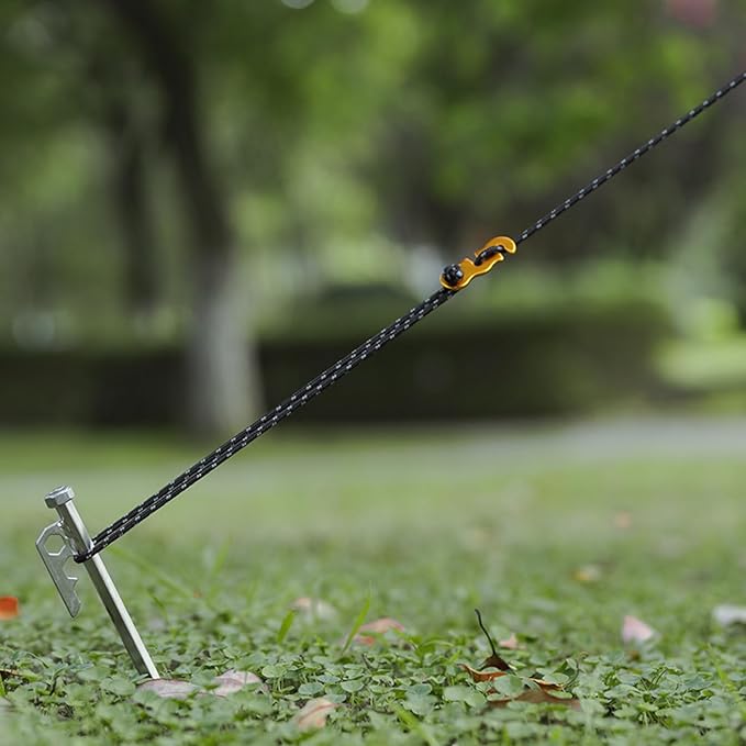 • Guy Lines with Tensioners: Each tarp rope comes with an aluminum tensioner for quick, tool-free setup; easily adjusts to fit tents, tarps, or gear of different sizes