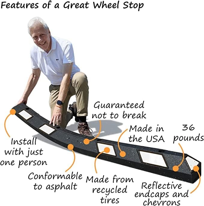 • DURABLE. Resistant to extreme temperature variations, UV light, oils, moisture, road salt and damage. Rubber Wheel Stops will not rust, chip, crack, crumble, corrode or need repainting.