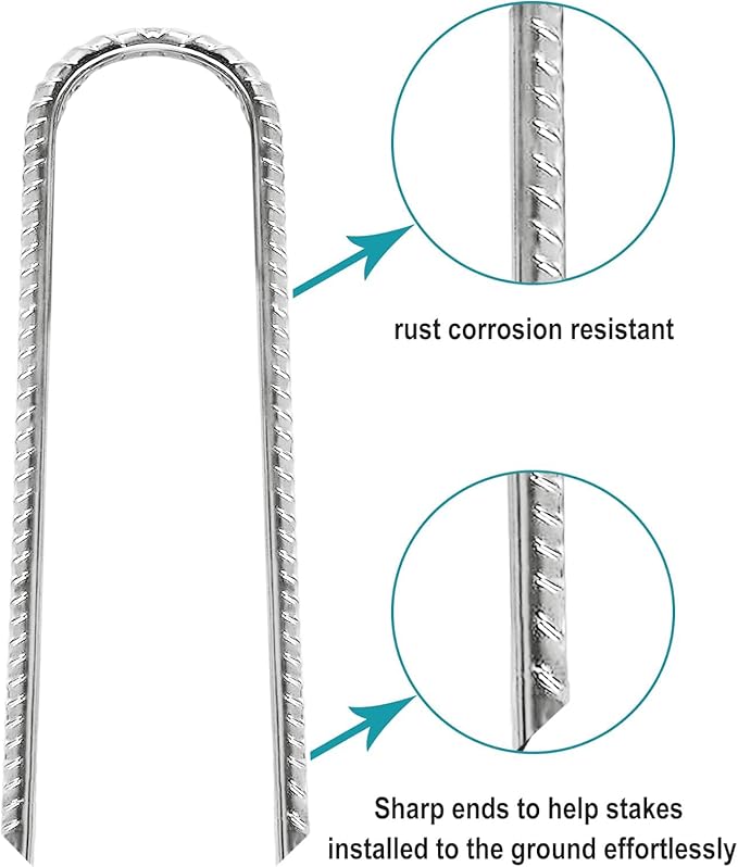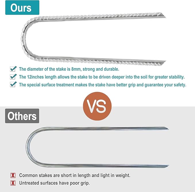 • Minimal Ground Disturbance: Despite their strong anchoring capability, U-shape canopy stakes are designed to penetrate the ground with minimal disruption, making them lawn-friendly.