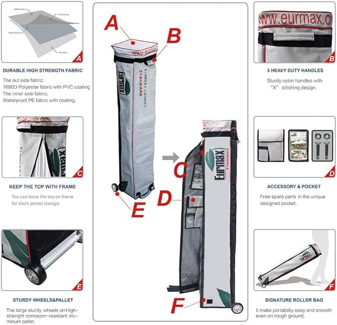 • Canopy Tent Roller Bag: Eurmax unique L shaped roller bag is oversize designed, it is easy to put frame and top in the bag. Big wheels, extra pockets for additional items, Heavy duty strong polyester fabric, 2 layer fabric sewed, reinforced handles, all these makes the bag long lasting.