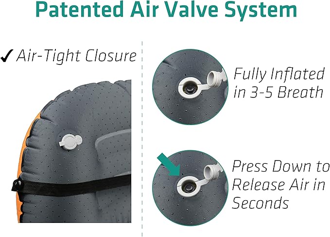 • Ease Of Use! With the simple click of a button, Inflate pillow by mouth with approximately 5-8 breaths. Once you are done you can conveniently deflate the pillow with the Quick Deflate feature which rapidly releases air after use in only seconds. With the unique technology in this compact and light pillow, you are able to adjust firmness to your personal sleep preference. You can Rest easy with our 100% Satisfaction Guarantee!