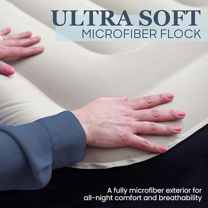 • WATERPROOF & PUNCTURE RESISTANT - The inflatable bed is made with strong, waterproof microfiber that stands up to routine use. These camping beds won't leave you in a puddle after a beverage spill or unexpected rainfall. Patching kit is included.