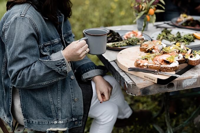 • Classic Enamelware Dish Set: The Barebones Enamel Cup features a vintage-inspired look that brings a rustic charm to your outdoor kitchen, camping trips, picnics, or backyard gathering