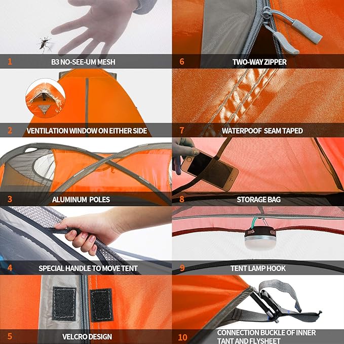 • 【Breathable & Stable】: Large section of mesh and 2 D-shaped doors with dual zippers provide much better ventilation. Equipped with 10 lightweight Alloy Pegs and 2 Wind ropes, the tent has a high resistance of wind.