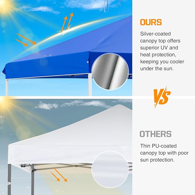 • PREMIUM STEEL FRAME WITH WEIGHT BAGS: Built to perform, the heavy duty canopy frame is made of high-grade, powder-coated steel and secured with hardened through-bolts for superior strength and rust resistance. Whether you’re using it as a canopy tent for events or a pop up tent for shade on the go, the included set of 4 weight bags helps anchor your setup for added stability in outdoor conditions