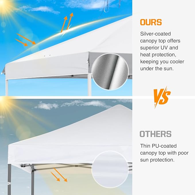 • HEAVY DUTY TOP WITH VENTED DESIGN: The EAGLE PEAK canopy features a CPAI-84 rated 150D silver-coated oxford top with double-stitched and heat-sealed seams for long lasting waterproof performance. This durable pop up canopy provides UPF 50+ sun protection and a large vent at the peak to release heat; ideal for staying cool at outdoor events, markets, or backyard gatherings