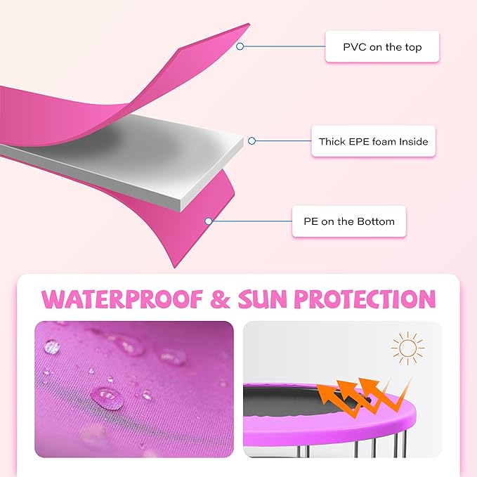 • Specification: Trampoline pad width: 8/10FT: 9.45 inch (24cm), 12FT: 8.66 inch (22cm), 14/15FT: 10.63inch (27cm). Anti-UV/Waterproof/Faded Resistance PVC cover,thick EPE foam(16mm), PE bottom, ultra durable for years to use!
