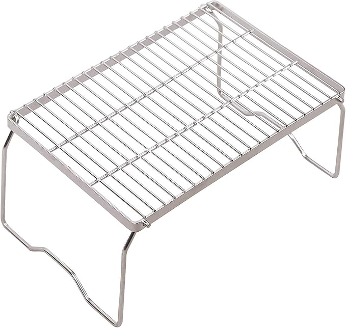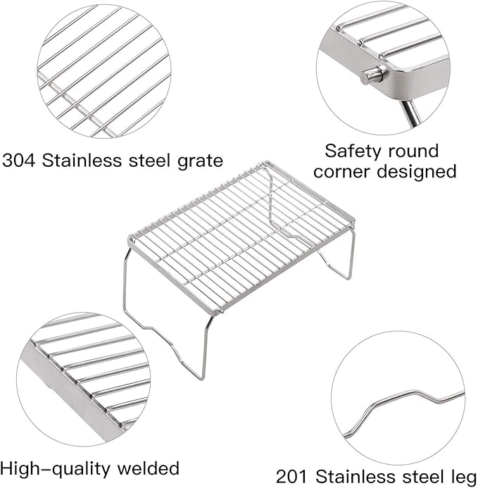 • HIGH QUALITY MATERIAL: The over-the-fire camping grill is made of 304 stainless steel grate and the legs are made of 201 stainless steel. This helps the grill resist oxidation and corrosion. Stainless steel also makes it lighter and more durable than iron.