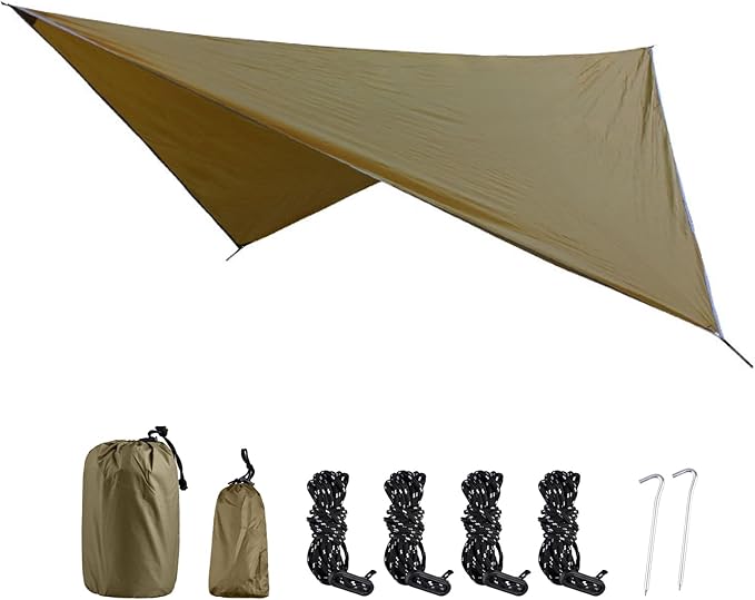 • ✅ EXTENSIVE APPLICATIONS -- The lightweight rain tarp can also play the role as Tent Shelter, Backpacking Tarp, Floor tarp, Rain Shelter, ideal for Camping, Hiking, Picnic, Cycling, Backpacking