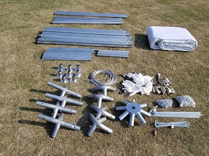 • INCLUDES: The package includes a Yellow/White Stripe PVC vinyl tent top, 1.5-inch steel frame tubing, steel pins, steel base plates and fittings that are resistant to rust and corrosion and a storage bag. Each piece of this inclusion is expertly designed and rigorously evaluated for durability