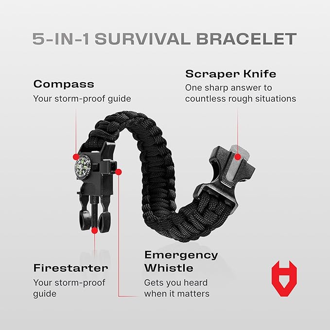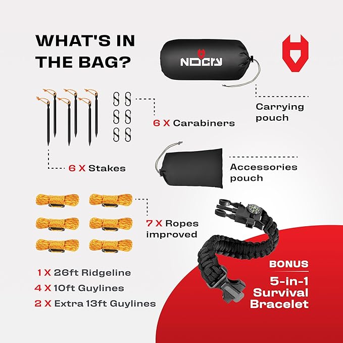 • THE GEAR YOU NEED IN ONE PLACE. Comes with 1 rainfly tarp, 6 aluminium stakes with orange reflective paracord ties, 6 carabiners, 7 adjustable ropes, 1 sack for the ropes and poles and 1 carrying pouch for all your gear. Just pack them together and put them in your bag. And, as a bonus, we’ve added a survival bracelet too!