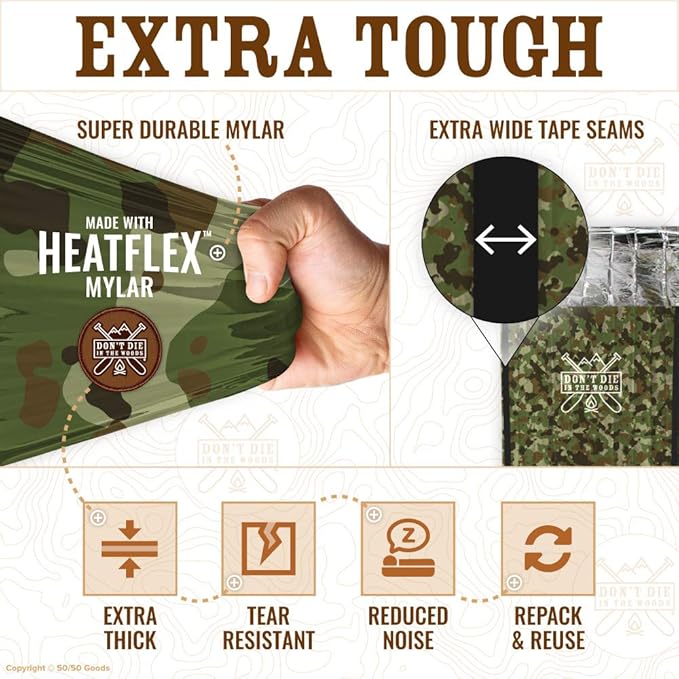 • TOUGHEST MYLAR SLEEPING BAG ON EARTH – Our tear-resistant, extra-thick HeatFlex mylar is stronger and more flexible than ordinary space blanket mylar. We’ve added a hood section to protect your head and reinforced tape seams to create a durable, reusable survival bivy you can use alone or to enhance your existing sleeping bag.