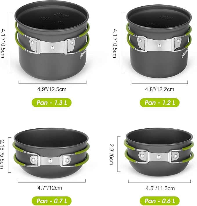• Best Money Ever Spent: The 16 pieces camping cookware kit includes 2 non-stick pots(1.2L&1.3L) + 2 non-stick pans(0.6L&0.7L) +1 mini stove (with storage case) +2 mugs + 2 spoons + 2 forks + 2 knives + 2 cleaning clothes + 1 Carry bag.