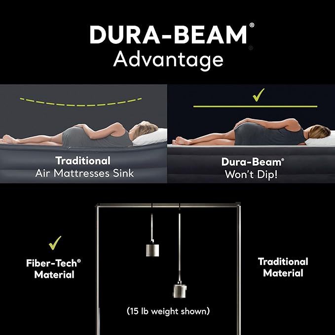 • DURABILITY – Unlike traditional air beds that tend to sink or dip over time, Dura-Beam Air Mattresses are designed to withstand the weight of the sleeper without sagging or losing its shape