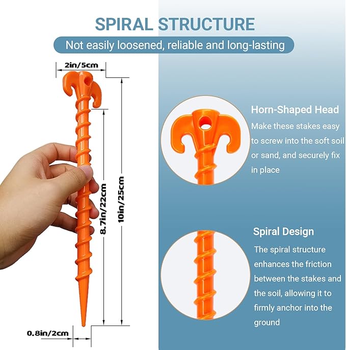 • ESSENTIAL ACCESSORIES - Spiral designed also makes these tent stakes easy to twist into soft dirt or sand, and reduces the risk from wind and heavy rain to keep your tent securely in place. Great for beach, canopies, tents, gazebos, tarps, groundsheets and gardening.