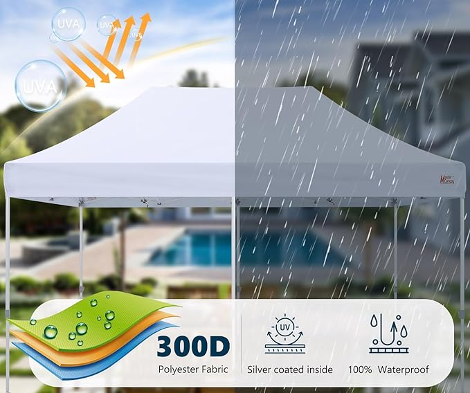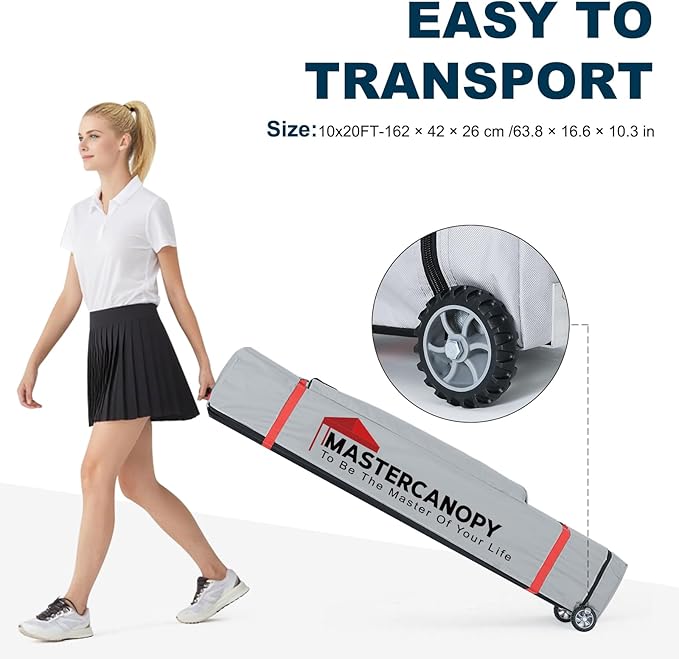 • ✅Large Space: 10 x 20 Pop Up Canopy with straight legs provides a true 200 square feet shade. Big enough for about 6-10 people to sit under it. Center height is 132 inch. Suitable for market stalls, parties, picnics or any outdoor events. MASTERCANOPY commercial canopy tent is suitable for both sunny and rainy days.