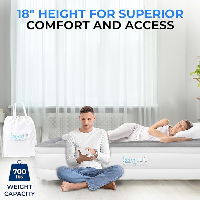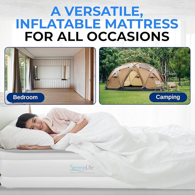 SereneLife Air Mattress with Built-In High Speed Pump – Self Inflatable Blow Up Full Size Airbed for Camping, Guests, Home & Travel – 18" Premium Raised Design, 700 lbs Capacity, Strong Spine Support