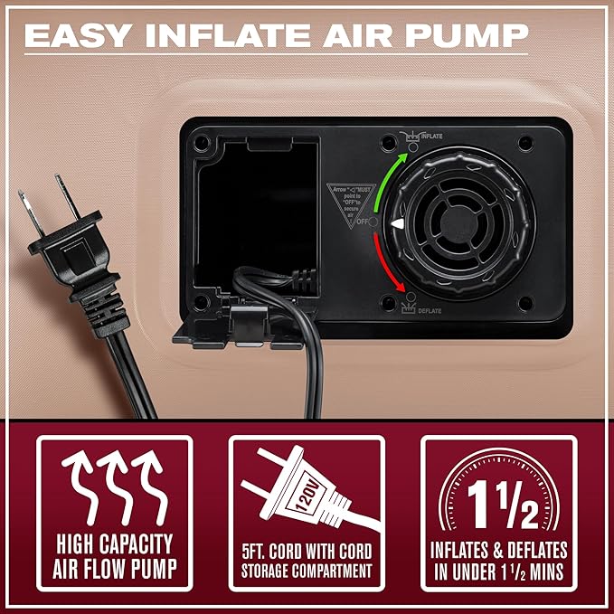 • Quick and Easy to inflate and deflate - The built-in air pump allows you to inflate and deflate the mattress quickly then discreetly pack the cord into the integrated storage compartment.