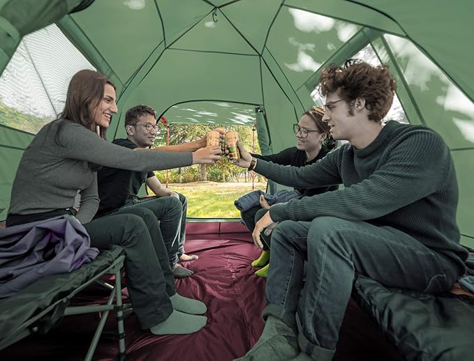 • ✔KAZOO outdoor camping tent offer 2 doors and 2 windows to provide excellent ventilation. We design a porch to offer you a comfortable 4 person tent, the footprint is included in porch area. As the comfortable tents for camping, the inner tent is full of mesh wall and ceiling to provide max view and airflow. Full coverage rainfly is designed to offer a high performance waterproof tent. This multifunctional 4 person camping tent makes your family closer to the nature.