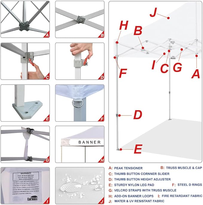 • 8x12 Canopy Tent Heavy Duty Fabric: CPAI-84,NFPA 701 & ULC S109 fire retardant certificated Durable polyester PU coated to block about 99% UV rays. Stitching lines are all seam sealed to prevent water penetrate from seams to make our canopy tent water resistant.