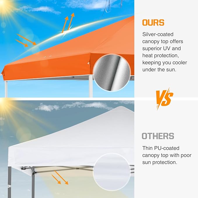 • HEAVY DUTY TOP WITH VENTED DESIGN: The EAGLE PEAK canopy features a CPAI-84 rated 150D silver-coated oxford top with double-stitched and heat-sealed seams for long lasting waterproof performance. This durable pop up canopy provides UPF 50+ sun protection and a large vent at the peak to release heat; ideal for staying cool at outdoor events, markets, or backyard gatherings