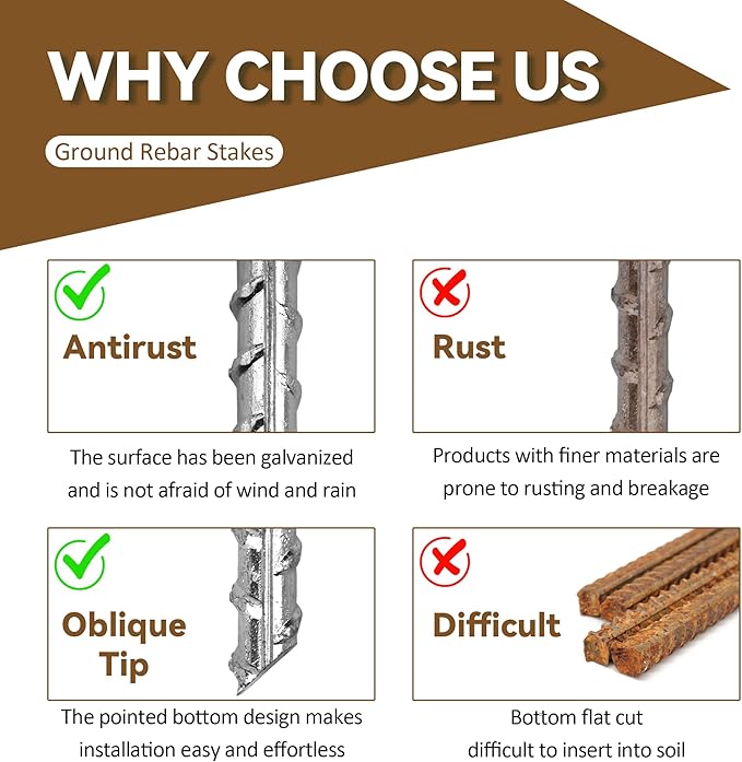 • Versatility in Applications: These rebar stakes offer versatility in their applications. They can be used for a wide range of purposes, including securing outdoor furniture, tents, canopies, tarps, pet enclosures, garden structures, and much more. Their adaptable design makes them suitable for various outdoor activities and projects