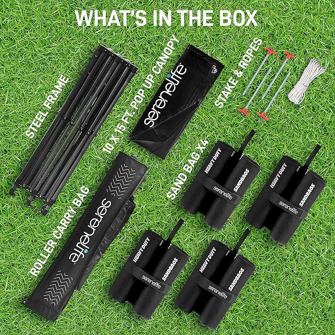 • WHEELED CARRY BAG: This heavy duty canopy set comes w/ wheel roller carry bag for portability and easy storage, (4) 35 lb sandbag, & stake & ropes. Perfect for beach, camping, backyard party, picnic, garden wedding event, outdoor sport & more