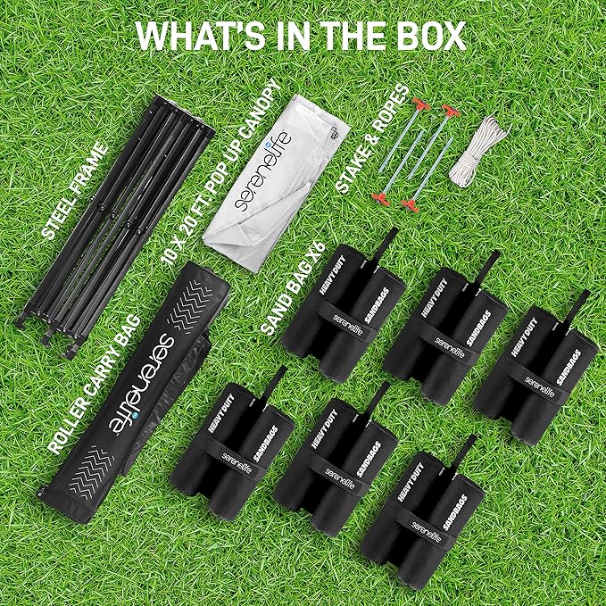 • WHEELED CARRY BAG: This heavy-duty canopy set comes w/ wheel roller carry bag for portability and easy storage, (4) 35 lb sandbag, & stake & ropes. Perfect for beach, camping, backyard party, picnic, garden wedding event, outdoor sport & more