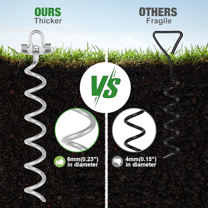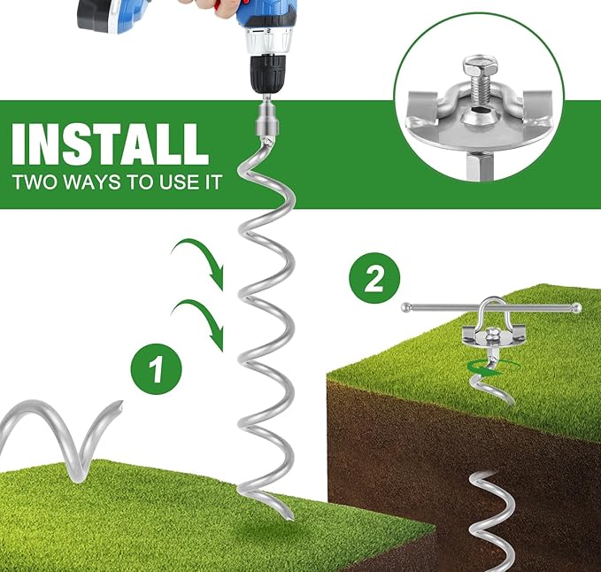 • EASY INSTALLATION AND USE - You only need to push the ground screw anchor head of the garden spiral stake into the ground, and you can directly rotate it by hand or electric drill until the spiral anchor is fully inserted into the ground. Outdoor spiral ground anchors are sturdy, very convenient to use, and very safe. This outdoor Spiral anchor is a good helper for your life.