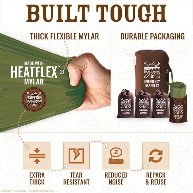 • TOUGHEST EMERGENCY BLANKETS ON EARTH – Exclusively from Don’t Die In The Woods, our HeatFlex mylar is thicker and more flexible than ordinary space blankets. Combined with durable packaging designed ultralight & compact for outdoor adventures, you won’t find tougher mylar emergency blankets anywhere.