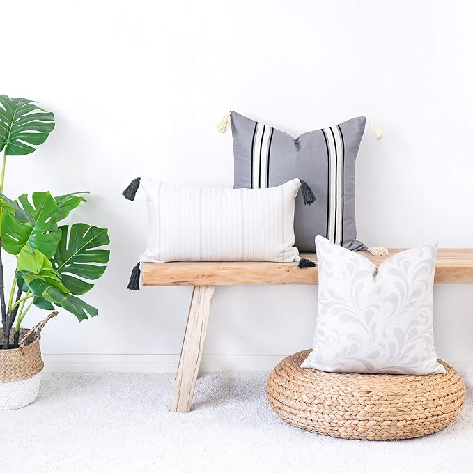 • TIMELESS DESIGN: Featuring patterned stripes against a relaxed linen base in shades of dark gray and white, the contrast corner tassels add energetic spirit to refresh any room instantly. Perfect for spring, summer, fall and Mid-century decor.