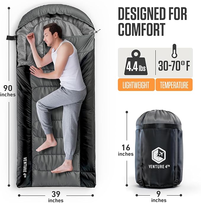 VENTURE 4TH Backpacking Sleeping Bag – XXL, Double and Single Sizes - Lightweight Warm & Cold Weather Sleeping Bags for Adults, Kids & Couples – Ideal for Hiking, Camping & Outdoor Adventures