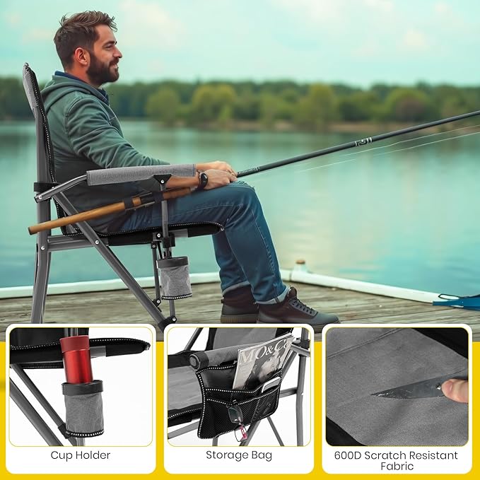 • 【Durable Fabric】: Smooth foam padded seat and backrest of this portable fold high back chair are made of 600D Oxford fabric, offering both breathability and durability. The padded design provides luxurious comfort, allowing you to relax for hours at a time without feeling fatigued.