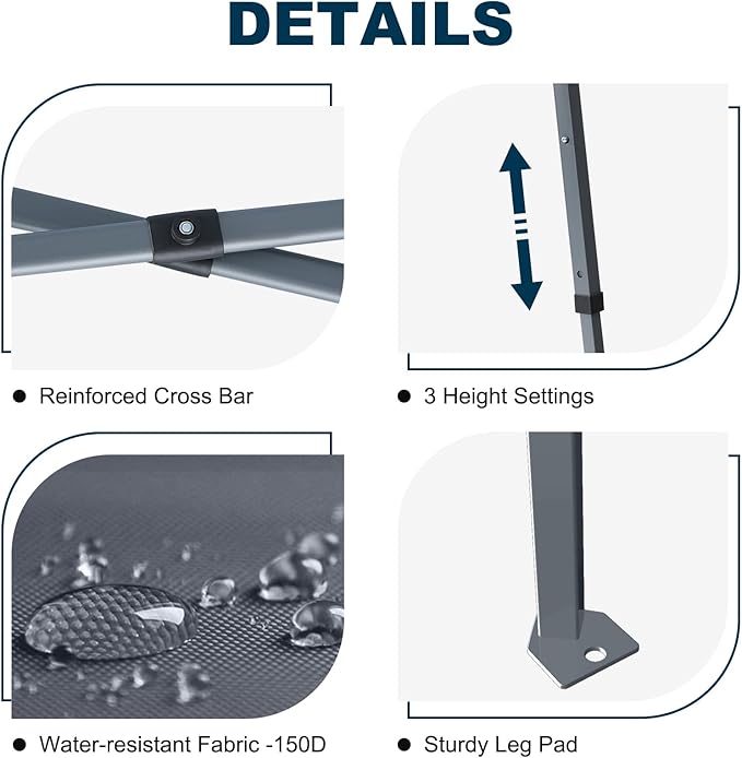 • ✅One Minute to Set Up: 1.Take the fully assembled frame with top out of the bag and pull it open. 2.Place the fabrics over the frame and extend the legs. 3.Adjust the height.Quick and simple.