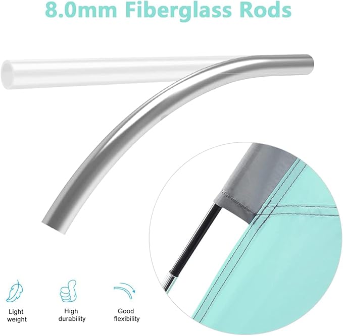 • Good Flexibility & Higher Durability - Fiberglass rods increased from 6.9 millimeter (market standard) to 8.0 millimeter for a more flexible and durable framework when installing in the shade. Dependable and reliable rods are essential, therefore we made this change in order to extend the rod’s lifespan, just to ensure our fiberglass rods can withstand multiple usage even after a long period of time.