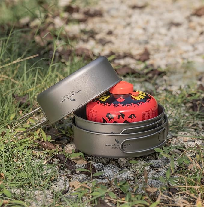 Boundless Voyage Titanium Pots Pans Set Camping Cookware 500ml 600ml 700ml Bowls Outdoor Portable Lightweight Stackable Cooking Kit with Folding Handle 3 Pieces Set Tableware for 1-3 Person Ti2032C