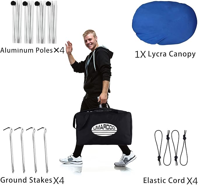 • DURABLE BEACH SHADE CANOPY: The strong and elastic Lycra fabric has UPF 50+ protection and water-resistant function. Rust-proof aluminum poles are attached with a elastic cord preventing moving.