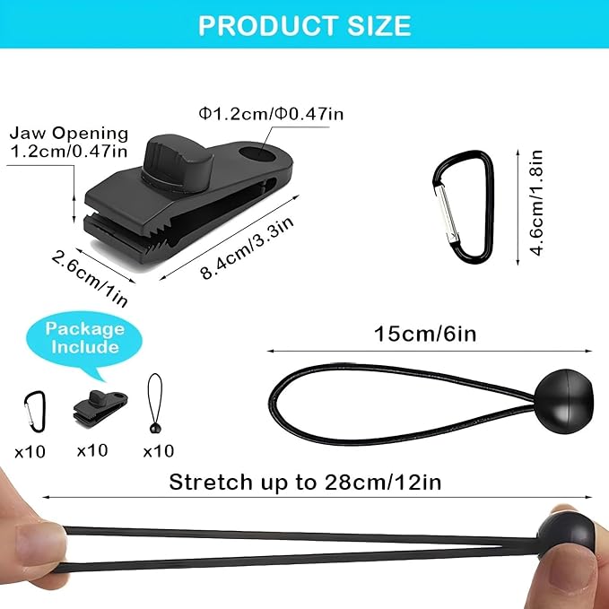 • Package comes in set of 10 Heavy Duty Tarp Clips + 15cm Bungee Ball Ropes + D-Shape Carabiners. You can buckle three items together to extend the reaching range where you fix to. Extremely practical kit for you camping voyage adventure.