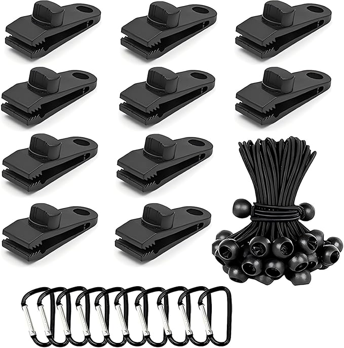 30-Piece Heavy Duty Camping Kit - Tarp Clips, Bungee Cords & Carabiners for Outdoor, Caravan, Tent Accessories (10 Clips +10 Cords +10 Carabiners)