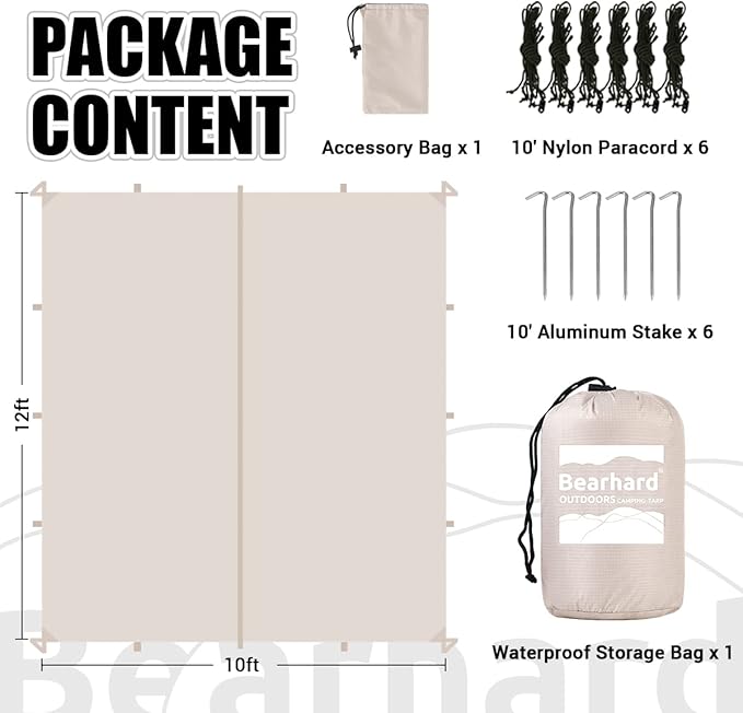 • [VERSATILE MULTI-PURPOSE TARP] Bearhard tarp is designed for use as a camping tarp, hammock rainfly, tent footprint and more. Constructed with durable materials and reinforced stitching, this lightweight and easy-to-set-up tarp is suitable for various outdoor activities such as camping, hiking, fishing, backpacking, climbing, and hunting.